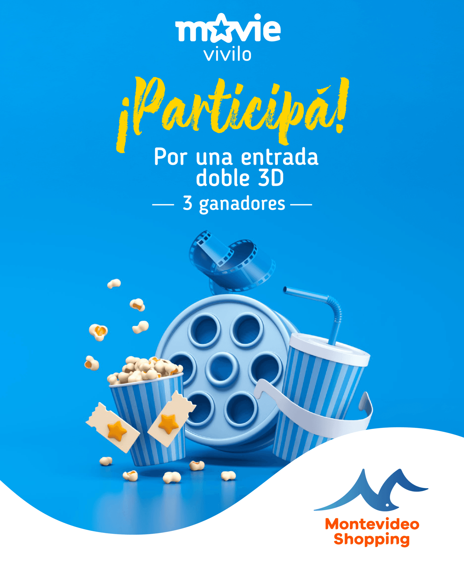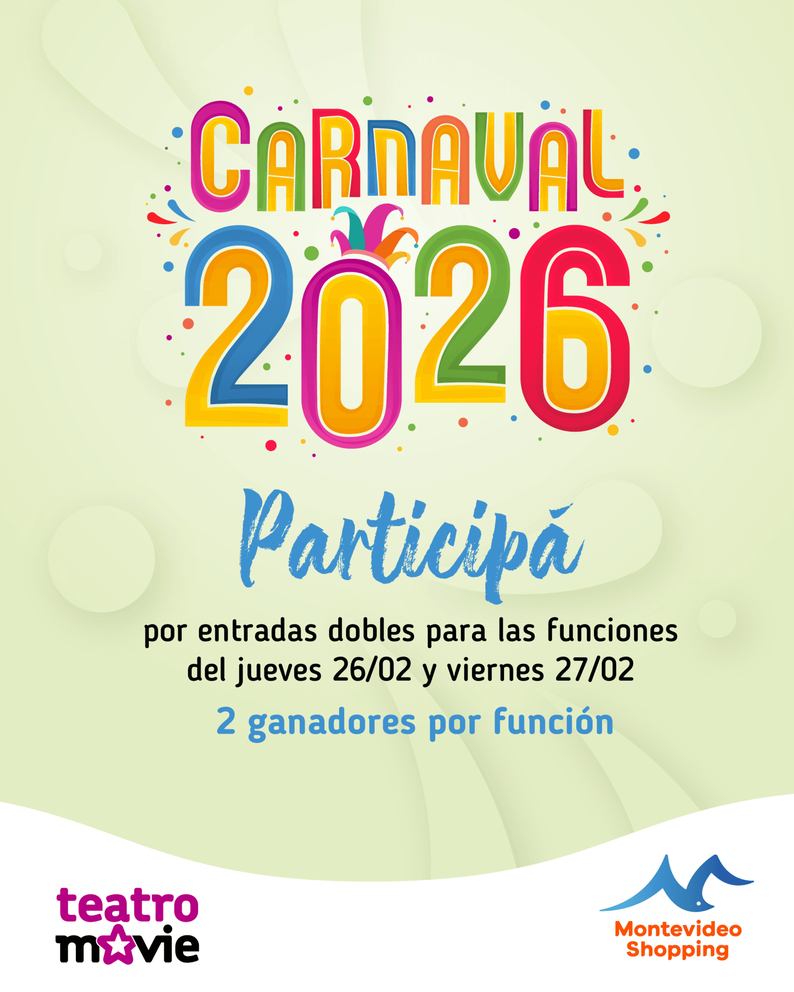 El premio consiste en 2 personas ganadoras de 1 entrada doble para la función del jueves 26/2 de Carnaval 2026 en Movie de Montevideo Shopping y 2 personas ganadoras de 1 entrada doble para la función del viernes 27/2 de Carnaval 2026 en Movie de Montevideo Shopping