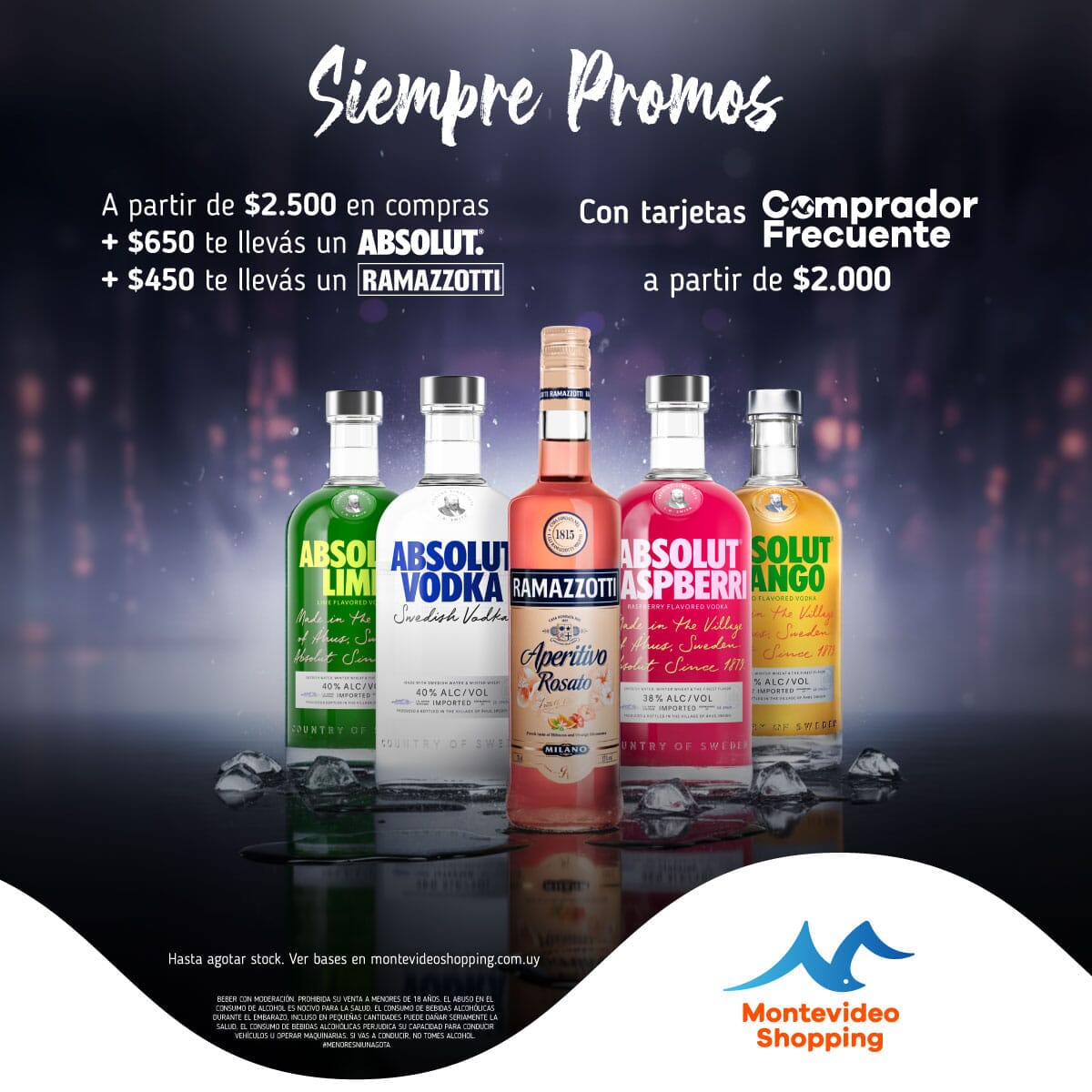A partir de $U 2.500 en compras (válido para acumulación de tickets y facturas) te llevas: + $ 650 te llevas un ABSOLUT VODKA + $ 450 Te llevás un APERITIVO RAMAZZOTTI